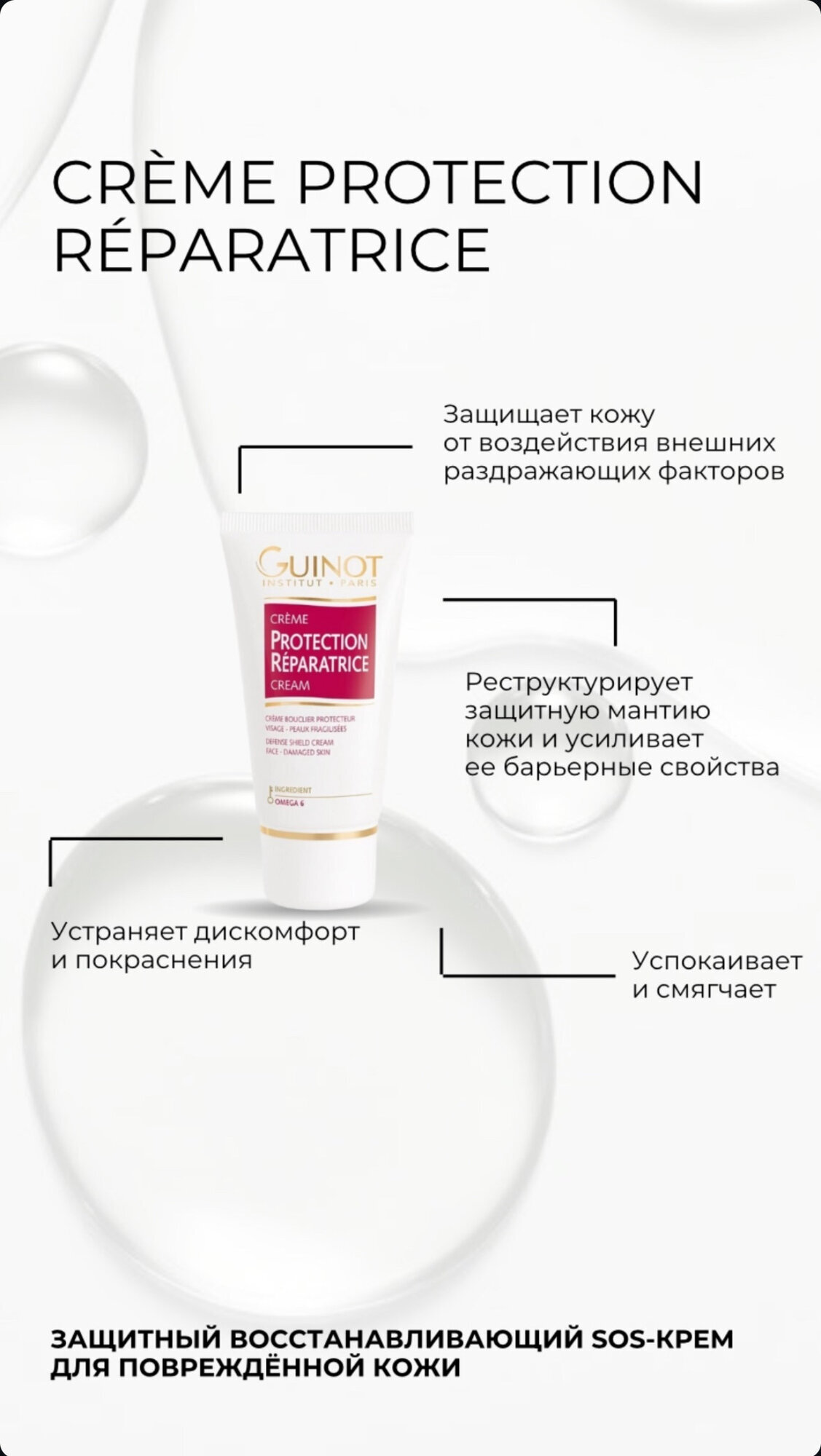 МЕХАНИЗМ ДЕЙСТВИЯ:1. Противовоспалительное действие благодаря синергетическому действию Омега-6 и запатентованного успокаивающего комплекса растительного происхождения.2. Восстановление барьера кожи благодаря высокой концентрации Омега-6 (линолевая и гамма-линолевая кислота).3. Увлажняющее действие: сохранение оптимального баланса влаги, предотвращение потери влаги (гидраструктурин).4. Антиоксидантное действие: защита клеток от повреждений свободными радикалами и окислительного стресса, благодаря растительным экстрактам.