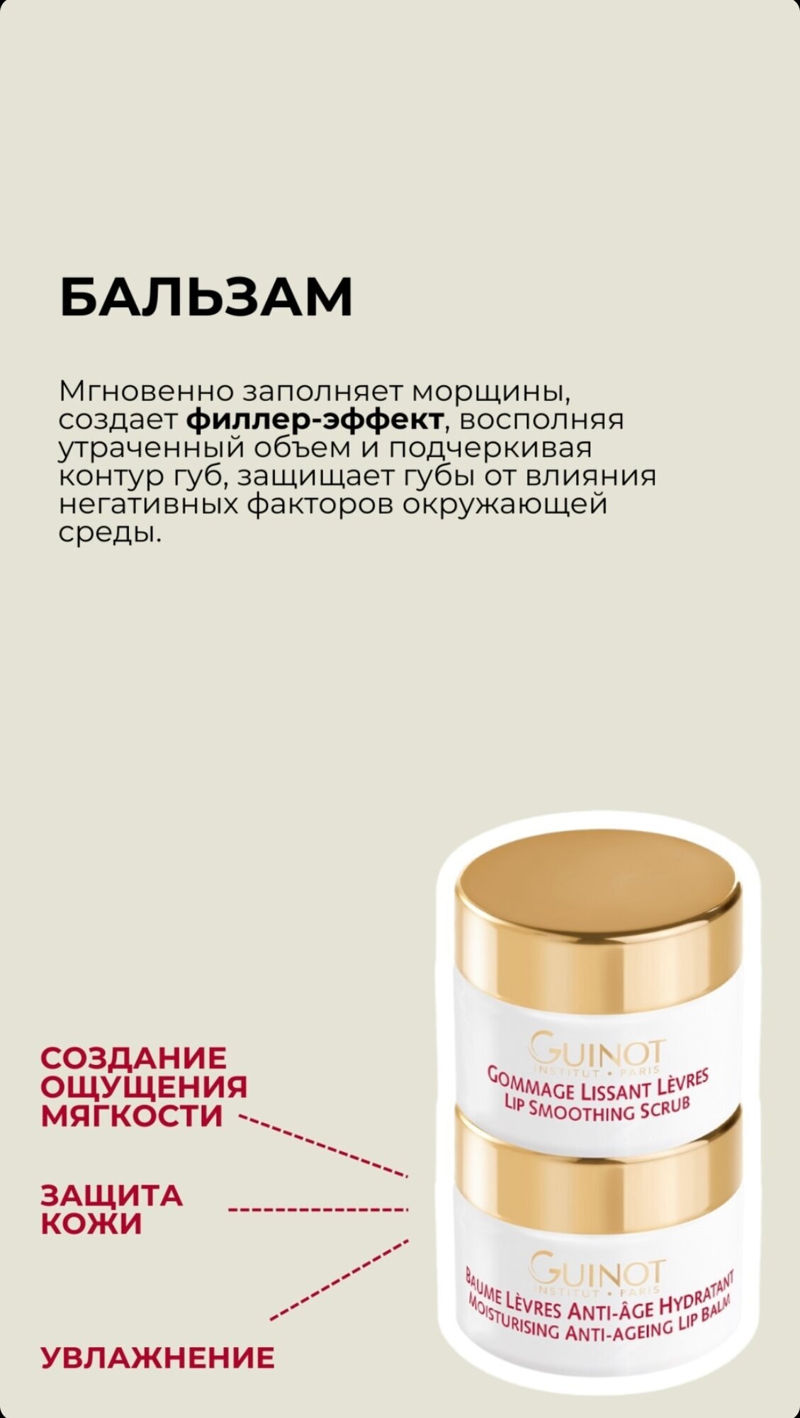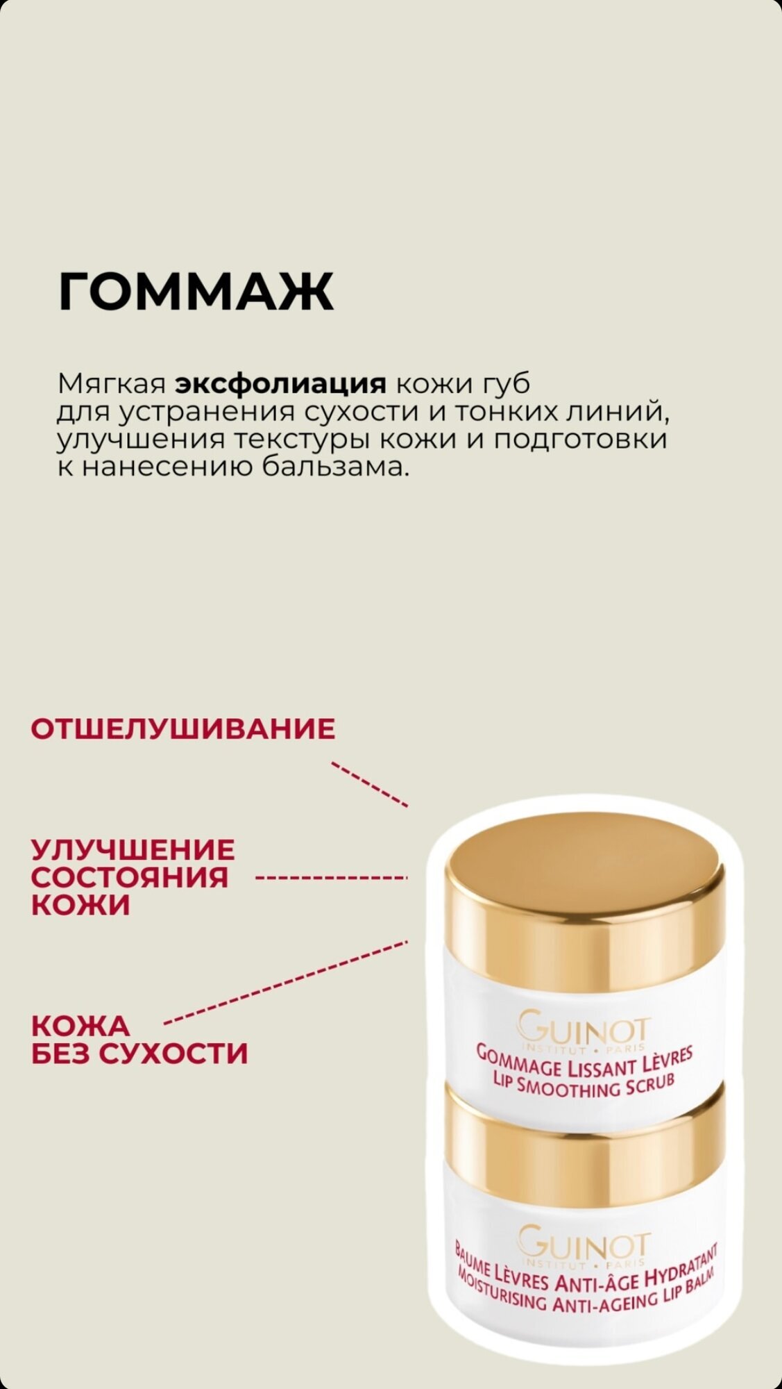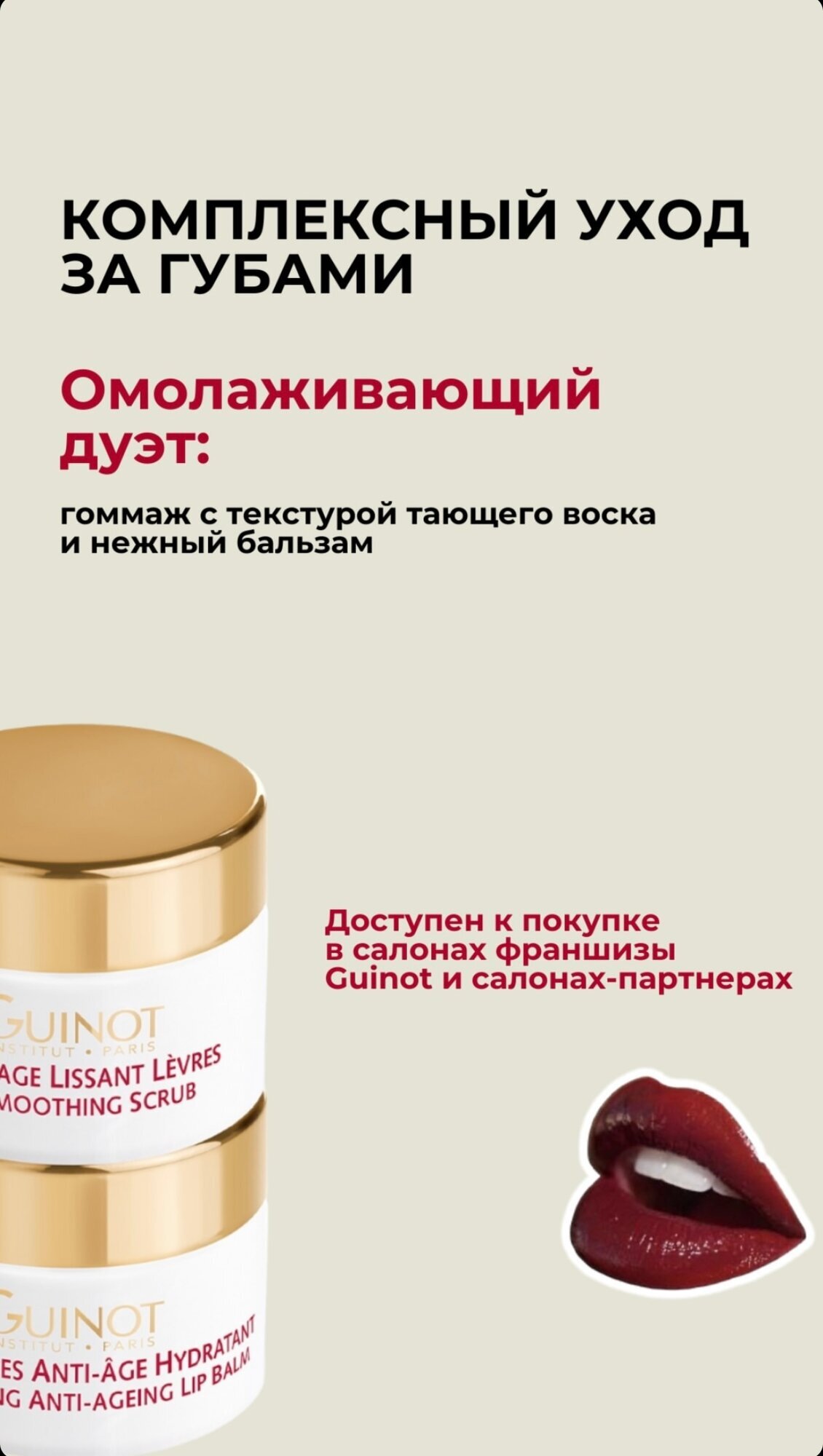 для всех типов кожи - Разглаживающий скраб для губ: разглаживающая, отшелушивающая процедура с сахарными крупинками, которая мягко отшелушивает омертвевшие клетки и помогает уменьшить мелкие морщинки, делая губы мягкими.- Антивозрастной увлажняющий бальзам для губ: средство для придания молодости и упругости с наполняющими шариками гиалуроновой кислоты для разглаживания тонких морщин, маслом манго для борьбы с признаками старения; а также увлажняющее и питательное средство с маслом сладкого миндаля, в частности, обладающее регенерирующей силой.ПОКАЗАНИЯ:• Морщины, тонкие линии• Тонкие, обезвоженные губыМЕХАНИЗМ ДЕЙСТВИЯ:1. Гоммаж для губ:Мягко эксфолиирует губы, удаляя ороговевшие клетки, разглаживает тонкие линии2. Увлажняющий омолаживающий бальзам для губ:Омоложение, наполнение, увлажнение и питание кожи губ и вокруг них.РЕЗУЛЬТАТЫ:• Тонкие линии разглаживаются. • Губы становятся напитанными, увлажненными, выглядят объемнее и отлично защищены от воздействия